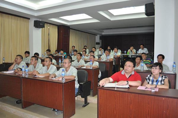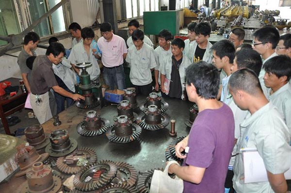 本次研討學(xué)習(xí)班共有來自全國各地區(qū)共計(jì)40名的一線服務(wù)人員參加。此次學(xué)習(xí)班,引起我司領(lǐng)導(dǎo)高度重視,不僅組織了相關(guān)部門領(lǐng)導(dǎo)系統(tǒng)授課:從新品介紹到各個(gè)機(jī)型的特點(diǎn),從發(fā)動機(jī)故障判斷維修到管路液壓件原理介紹,從制動系統(tǒng)學(xué)習(xí)到油缸的拆裝;而且與相關(guān)配套廠商協(xié)商,組織全體學(xué)員到相應(yīng)的工廠系統(tǒng)學(xué)習(xí)驅(qū)動橋、變速箱、變矩器等主要零配件安裝維護(hù)課程!